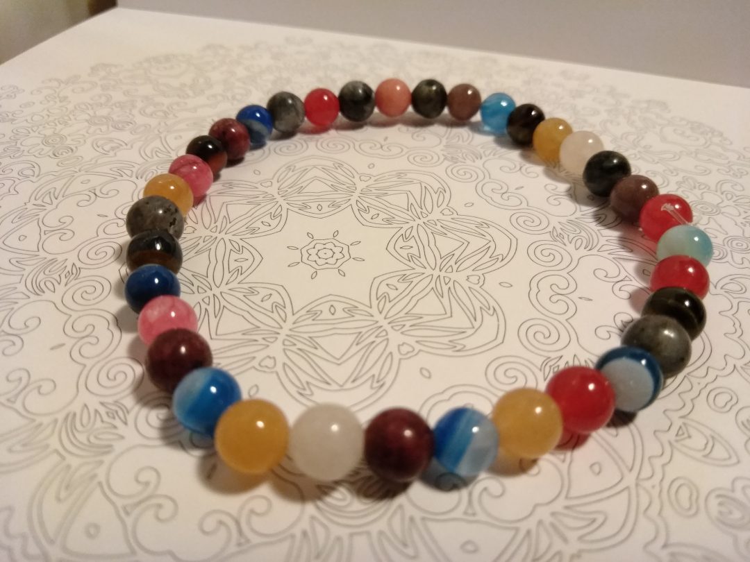 35 de bilute din pietre semipretioase: agat, jasp, aventurin, opal, jad, ochi de tigru si inca cateva, insirate pe guta elastica de 0.8mm. Unicat.